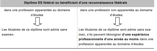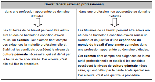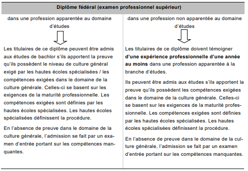 En 2015, sur mandat du Secrétaire d’Etat à la formation, à la recherche et à l’innovation, swissuniversities a formulé les modalités suivantes pour l’admission des diplômes de la formation professionnelle supérieure (ES) à un cursus de bachelor HES. Elles sont réglées dans la Best Practice pour l'admission aux études de bachelor dans les hautes écoles spécialisées.