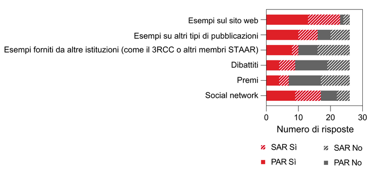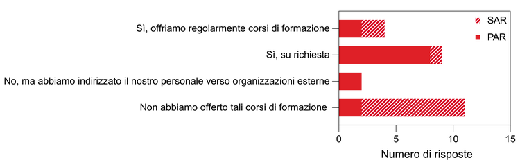 - La maggior parte delle PAR ha organizzato corsi di formazione su come comunicare con la stampa o ha indirizzato il personale verso organizzazioni esterne che forniscono tali corsi (84%, 12/14). Questa pratica non è stata comune tra le SAR.