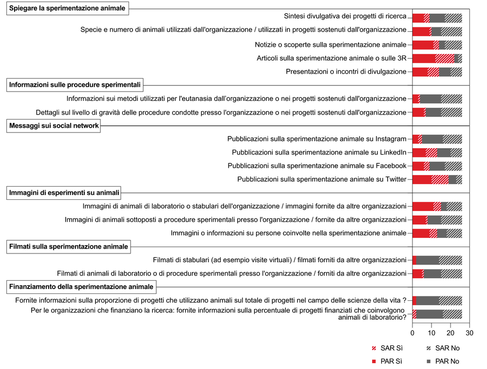 - Il 64% (9/14) delle PAR e l'8% (1/12) delle SAR hanno pubblicato informazioni sulle specie e sul numero di animali utilizzati.