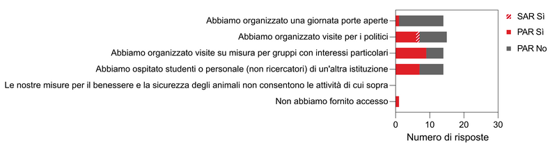 Le visite degli stabulari permettono al pubblico di vedere gli animali di laboratorio e di saperne di più sulle loro condizioni di allevamento. La maggior parte delle PAR (93%) ha aperto le proprie strutture al pubblico e ha organizzato visite (43% per i politici; 64% per gruppi con interessi particolari). Solo il 7% (una) delle PAR ha consentito l'accesso agli stabulari durante una giornata porte aperte; un membro non ha ricevuto nessuna richiesta di visitare gli stabulari. Le SAR non hanno stabulari, devono quindi coordinarsi con altri membri STAAR per organizzare tali visite. Solo un membro di questa categoria ha organizzato un evento.