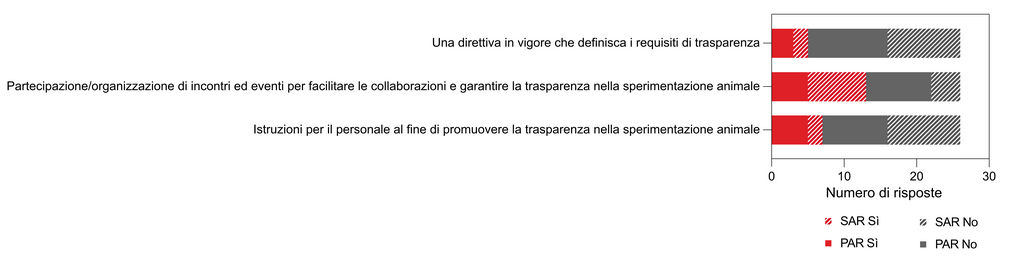L'aumento della trasparenza va di pari passo con l'incoraggiamento del personale a comunicare apertamente e a migliorare le proprie capacità comunicative. La maggior parte delle PAR ha offerto una formazione su come dialogare con la stampa o ha indirizzato il personale verso organizzazioni esterne (86%). Ciò non è comune tra le SAR, forse perché i loro dipendenti non sono direttamente coinvolti nella sperimentazione animale.