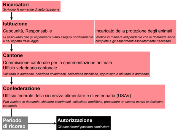 La sperimentazione animale in Svizzera si basa su tre pilastri fondamentali: autorizzazione, formazione e ispezione. Il processo di autorizzazione a più livelli è descritto nella Figura 1. Per quanto riguarda la formazione, i ricercatori, i responsabili di progetto e gli addetti alla cura degli animali devono rispettare i requisiti della formazione di base e continua. Infine, le autorità cantonali sono tenute a ispezionare ogni anno gli stabulari e almeno il 20% dei progetti autorizzati.