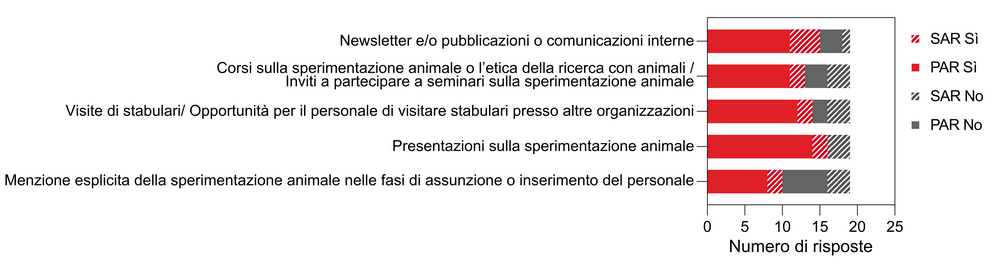 Meno del 50% delle SAR ha organizzato visite di stabulari, tenuto presentazioni o invitato i dipendenti a partecipare a seminari sulla sperimentazione animale. Questi membri non dispongono di stabulari e non offrono corsi e workshop, devono quindi organizzare questo tipo di attività in collaborazione con istituzioni esterne.