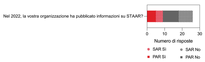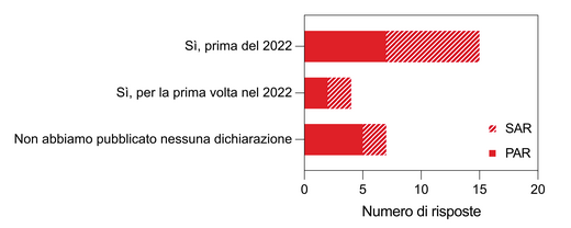 Solo il 34% (5/14) delle PAR e due SAR non hanno raggiunto questo obiettivo nel 2022; al momento della compilazione del questionario, la maggior parte di esse stava preparando una dichiarazione da pubblicare nel 2023.