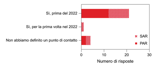 La maggior parte dei membri (81%, 21/26) aveva nominato un referente per le richieste di informazioni sulla sperimentazione animale già prima del 2022; un ulteriore membro ha designato un punto di contatto nel 2022. Due PAR e due SAR non avevao ancora nominato un referente alla fine del 2022.