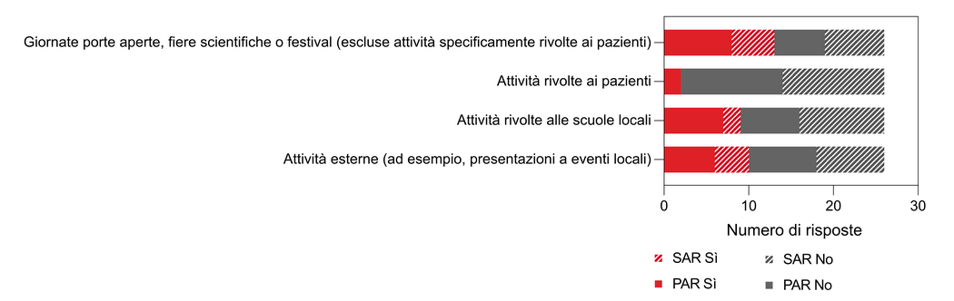 - La maggior parte delle organizzazioni (93% delle PAR e 67% delle SAR) si sono messe al servizio della comunità locale e delle scuole organizzando o sostenendo eventi per il pubblico. Due PAR hanno organizzato eventi rivolti specificamente ai pazienti.