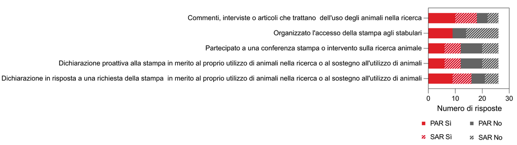 I membri hanno riferito di comunicare apertamente sulla sperimentazione animale in risposta a richieste esterne, ad esempio quelle della stampa (64% delle PAR e 58% delle SAR); inoltre, hanno offerto opportunità per saperne di più sulla ricerca con animali, facilitando l'accesso agli stabulari (64% delle PAR), rilasciando dichiarazioni o interviste e contribuendo ad articoli (71% delle PAR e 67% delle SAR). Le dichiarazioni proattive alla stampa sono state meno comuni (46% e 50%). Tutti i membri hanno risposto alle richieste della stampa; in un solo caso, un membro non ha potuto rispondere a una richiesta. Va notato che in alcuni casi l'accesso agli stabulari deve essere limitato a causa di rigidi protocolli igienici.