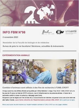 UNIL: In allen Newslettern der Fakultät für Biologie und Medizin wird nun systematisch ein Abschnitt über Tierversuche aufgenommen, um über dieses Thema zu informieren. Dieser Newsletter geht an die Mehrheit der Mitarbeitenden, Lehrerinnen und Forschende, die KEINE Tierversuche durchführen.