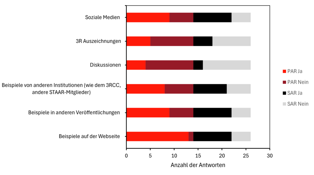 - Die meisten PARs (10/14, 71 %) boten Medienschulungen an oder verwiesen ihre wissenschaftlichen Mitarbeitenden an externe Organisationen zur Weiterbildung. Dies ist bei den SARs nicht üblich (nur 2 von ihnen boten Schulungen an), möglicherweise weil ihre Mitarbeitenden nicht direkt an der Forschung mit Tieren beteiligt sind.