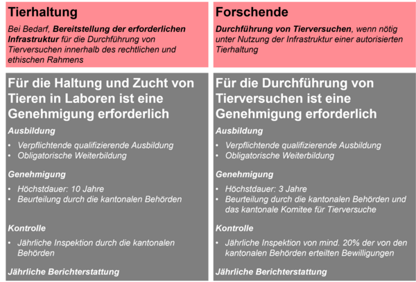 Die Tierversuche in der Schweiz stützen sich auf drei wichtige Säulen: Bewilligung, Ausbildung und Kontrolle. Das mehrstufige Bewilligungsverfahren für die Durchführung von Tierversuchen ist in Abbildung 1 dargestellt; die gesetzlichen Anforderungen an den Betrieb einer Tierversuchsanlage sind in Abbildung 2 ersichtlich. Im Bereich der Ausbildung müssen Forschende, Versuchsleitende, Tierschutzbeauftragte sowie Tierpflegende die Anforderungen an die Aus- und Weiterbildung jederzeit erfüllen. Schliesslich sind die kantonalen Behörden verpflichtet, jährlich mindestens eine Inspektion aller Tieranlagen durchzuführen und mindestens 20 Prozent der bewilligten Tierversuche zu kontrollieren.
