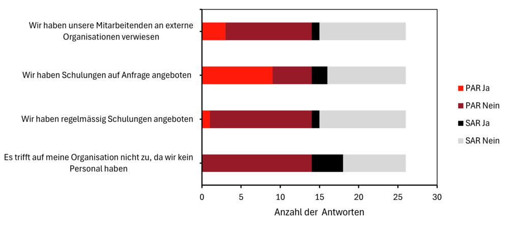 Die Erhöhung der Transparenz geht Hand in Hand mit der Ermutigung der Mitarbeitenden, offen zu kommunizieren und ihnen die Möglichkeit zu geben, ihre Kommunikationsfähigkeiten zu verbessern. Die meisten PARs (10/14, 71 %) boten Medientrainings an oder verwiesen ihre Mitarbeitenden an externe Organisationen. Bei den SARs ist dies nicht üblich (nur 2 von ihnen boten Schulungen an), möglicherweise weil einige von ihnen keine Mitarbeitenden haben, sondern nur Mitglieder, die in anderen Organisationen beruflich aktiv sind.