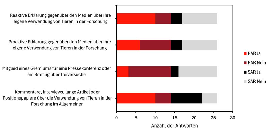 Alle PARs haben mindestens zwei der 4 vorgeschlagenen Aktivitäten durchgeführt. Besuche von Versuchstierhaltungen wurden von 9 PARs (9/14, 64 %) organisiert, während 10 von ihnen (10/14, 71 %) durch Präsentationen, Kurse oder Newsletter über tierexperimentelle Forschung informierten.
