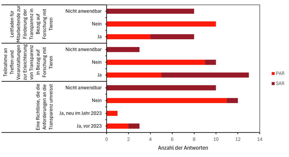 Es sei darauf hingewiesen, dass die Frage "Explizite Erwähnung von Tierversuchen während des Einstellungs- und Einführungsprozesses" aus dem Fragebogen gestrichen wurde, da viele PARs es für unrealistisch hielten, dies systematisch für alle Neueinstellungen einzuführen.