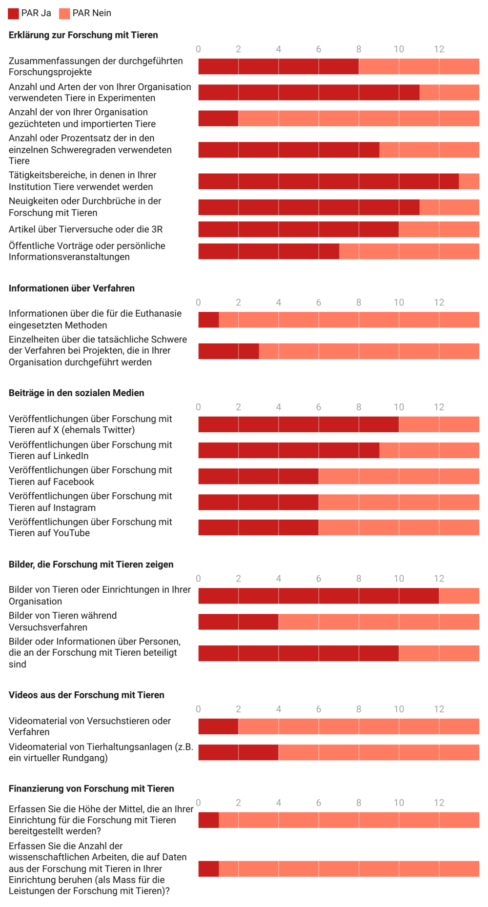- Mit einer Ausnahme veröffentlichten alle PARs Informationen über die Forschungsbereiche, in denen an ihren Einrichtungen Tiere verwendet werden.