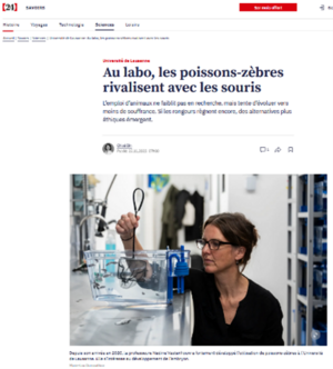 UNIL: Veröffentlichung eines Artikels in der Zeitung 24heures über die Arbeit eines Forschers, der mit Zebrafischen arbeitet, und Organisation eines Besuchs für die Medien. Link