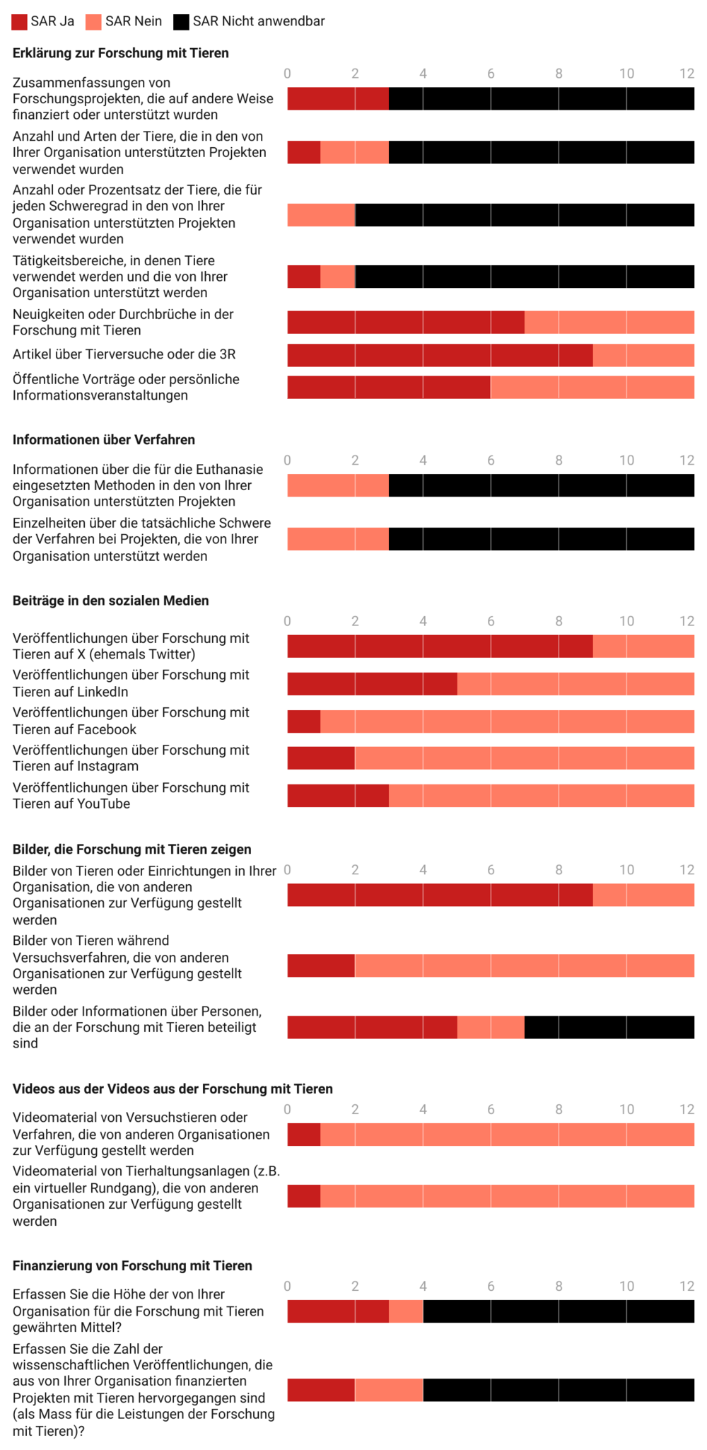 Die SARs wurden auch nach der Veröffentlichung der Anzahl und der Arten von Tieren sowie zu den Schweregraden der in den unterstützten Projekten durchgeführten Experimente befragt; diese Frage betraf jedoch nur drei SARs, die Projekte mit Tieren finanzieren oder unterstützen. Nur ein Mitglied veröffentlichte Zahlen über Tiere, die in den von ihm unterstützten Projekten verwendet wurden.