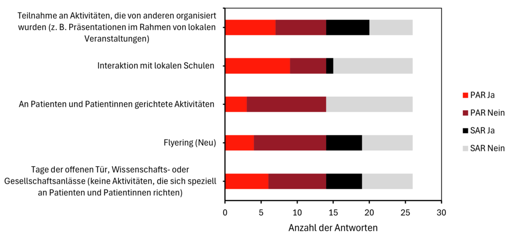 - Die meisten PARs (12/14, 86 %) organisierten oder beteiligten sich an mindestens einer Aktivität für die Öffentlichkeit, entweder für Patient:innen, Schulen oder die allgemeine Öffentlichkeit. Diese Aktivitäten wurden von 7/12 SARs (58 %) durchgeführt. 4 PARs und 5 SARs gingen auf die Strasse, um Fragen zur Forschung mit Tieren zu beantworten und dieses Thema offen zu diskutieren.