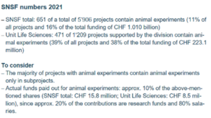 SNF: Der SNF verfügt nicht über Informationen über die Gesamtzahl der in den von ihm unterstützten Forschungsprojekten verwendeten Tiere, sondern nur über die Anzahl der geförderten Projekte, die für ihre Durchführung Tierversuche vorsehen. Diese Informationen werden zusammen mit den Angaben zu den Fördermitteln für Projekte, die Tierversuche beinhalten, veröffentlicht. Link