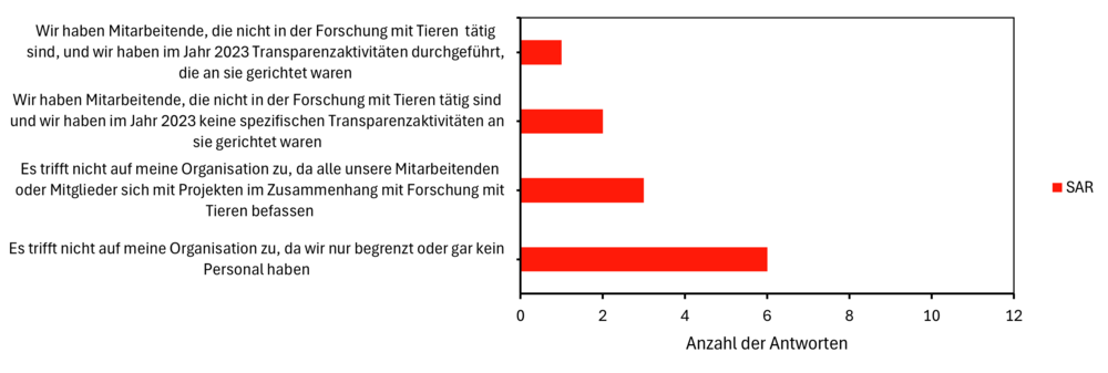 Im Fragebogen 2023 wurde diese Frage verfeinert, um die Organisation der SARs besser widerzuspiegeln, die in den meisten Fällen nur wenig oder gar kein Personal haben oder deren gesamtes Personal sich mit Projekten im Zusammenhang mit der Forschung mit Tieren beschäftigt. Von den 3 SARs, die Personal haben, das nicht mit tierexperimenteller Forschung zu tun hat, hat 1 diese Personen über Newsletter und/oder interne Veröffentlichungen oder Mitteilungen informiert.