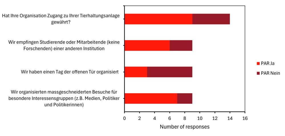 7 von 9 PARs, die ihre Tierhaltungen geöffnet haben, empfingen spezielle Interessensgruppen wie z.B. Politiker:innen, Journalist:innen und Feuerwehrleute, während 6 dieser 9 PARs Studierende oder Mitarbeitende anderer Einrichtungen, einschliesslich Schulen, begrüssten. Eine zunehmende Anzahl von PARs (3 im Jahr 2023 gegenüber 1 im Jahr 2022) öffnete die Tierhaltungsanlagen an Tagen der offenen Tür für externe Besucher:innen. Mitglieder, die ihre Einrichtungen nicht für externe Besuchende öffnen konnten, gaben Sicherheit und Hygiene als Hauptgründe an, z. B. Hochsicherheits-Biolabor (Biocontainment).