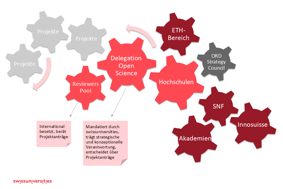 Die Programmkoordination Open Science des Generalsekretariats von swissuniversities bereitet die Geschäfte zuhanden der Delegation vor und stellt die Programmumsetzung und -entwicklung sicher. Für die Beurteilung von Projektanträgen steht der Delegation ein Reviewers’ Pool mit über 60 Expert:innen zur Verfügung.