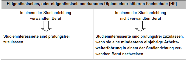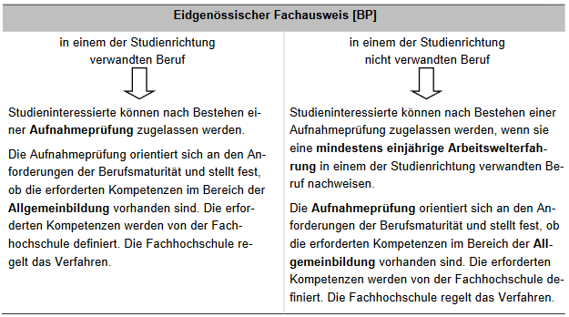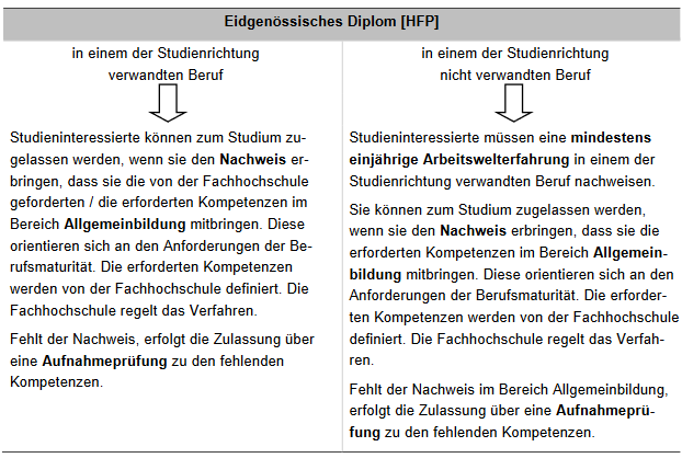 Im Auftrag des Staatssekretariats für Bildung, Forschung und Innovation hat swissuniversities 2015 die nachfolgenden Modalitäten zur Zulassung von Abschlüssen der Höheren Berufsbildung HBB zu einem Bachelorstudium an einer Fachhochschule formuliert. Sie sind in der Best Practice zur Zulassung zum Bachelorstudium an Fachhochschulen geregelt.